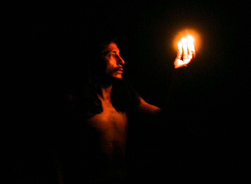 » El ritual inicia con el pulgar, el índice, el medio, el anular y el meñique irradiando fuego, a manera de candelabro humano. La propuesta trasciende así lo visual y se instala dentro de una percepción sensorial, de temblores internos, inducido por la sensibilidad que sugieren las yemas de los dedos»